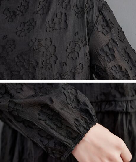 長袖ワンピース レディース ワンピース 花柄 フラワー カジュアル お出掛け ブラック 黒 ラウンドネック ゆったり 体型カバー シック レトロ フリル ミディ丈 長袖ワンピース レディース