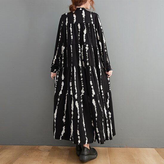 ロングシャツワンピース レディース 長袖ワンピース ロング丈 カジュアル おしゃれ ブラック 黒 柄プリント ゆったり 体型カバー ルーズ レトロ プルオーバー ロングシャツワンピース レディース