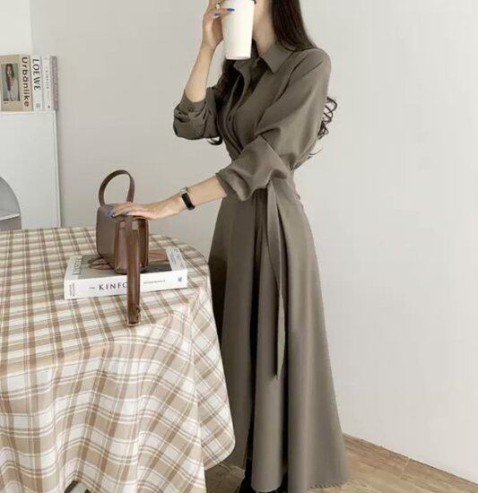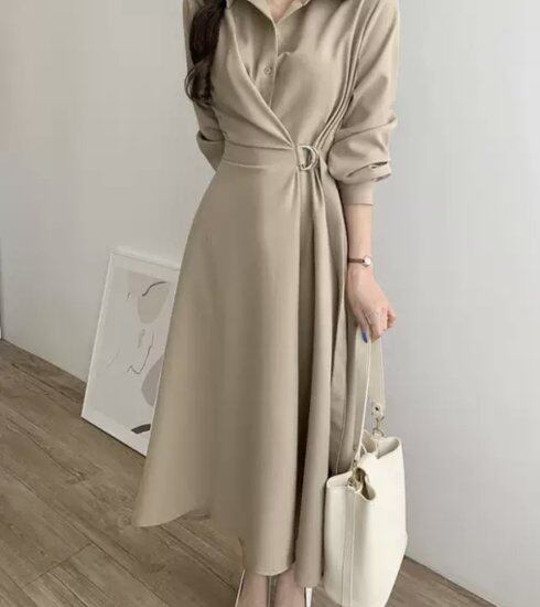 ウエストベルトシャツワンピース お洒落 バックル ベルト ラップ シャツ ワンピース レディース ロング丈 エレガント 上品 シンプル 無地 ウエストマーク かわいい デート 通勤 オフィス