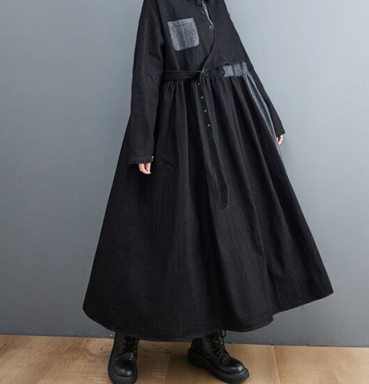長袖ロングワンピース レディース ワンピース ロング丈 襟あり 黒 ブラック カジュアル お出掛け アシンメトリー デニムワンピース モード系 ビッグシルエット オーバーサイズ ゆったり