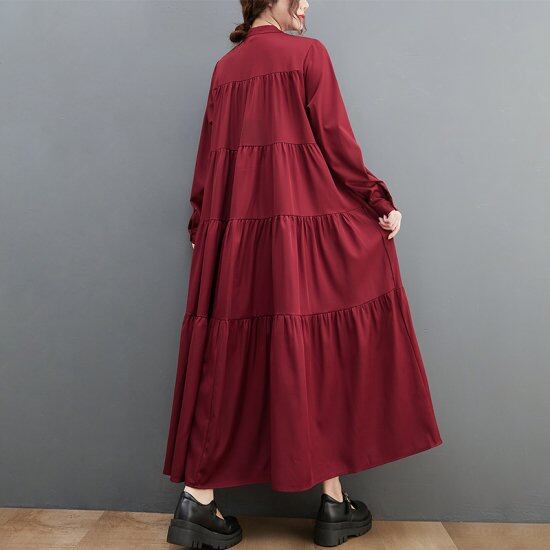 長袖ロングシャツワンピース レディース カジュアルワンピース ロング丈 ワンピース ティアードスカート 無地 お出掛け おしゃれ デイリー ゆったり 体型カバー ルーズ スタンドカラー 春秋
