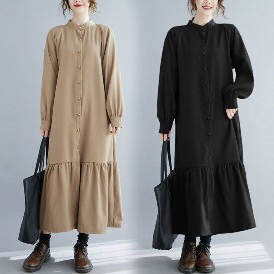長袖ロングワンピース レディース ワンピース カジュアル ロング丈 スタンドカラー ゆったり ルーズ 体型カバー おしゃれ デイリー 無地 長袖 ボタン 長袖ロングワンピース レディース ワンピース