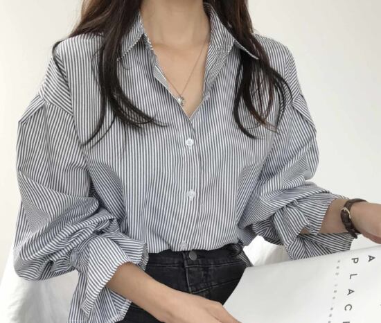 長袖シャツ レディース ブラウス トップス ストライプ ボリューム袖 コットン 綿 フリル オフィス カジュアル きれいめ お出掛け おしゃれ ブラック ブルー 黒 青 ビジネス 長袖シャツ
