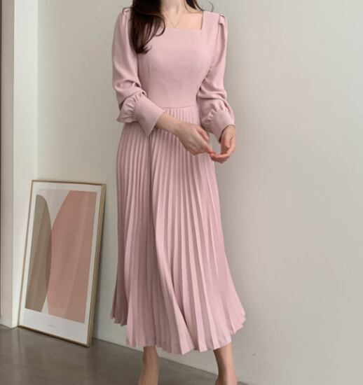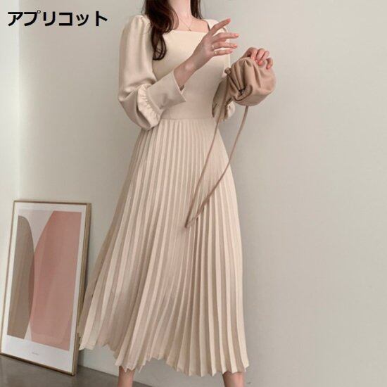 プリーツワンピース レディース ロングワンピース スクエアネック 長袖ワンピース きれいめ ハイウエスト おしゃれ お出掛け 無地 Aライン プリーツスカート プリーツワンピース レディース