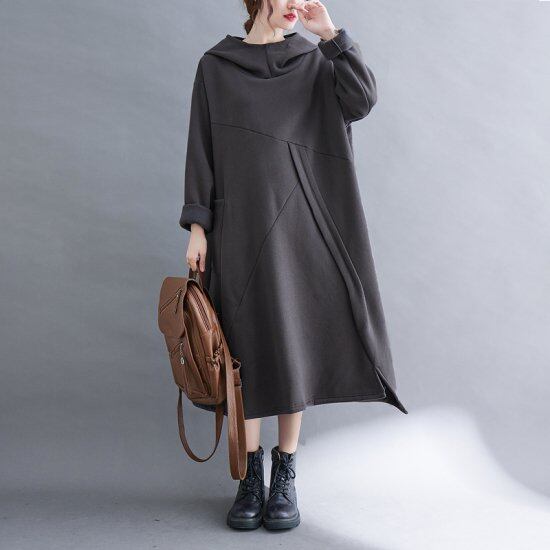 フード付きロングワンピース レディース ワンピース カジュアルワンピース 長袖 ロング丈 ゆったり 体型カバー 暖かい 秋冬 Aライン グレー ブラック おしゃれ お出掛け フード付きワンピース