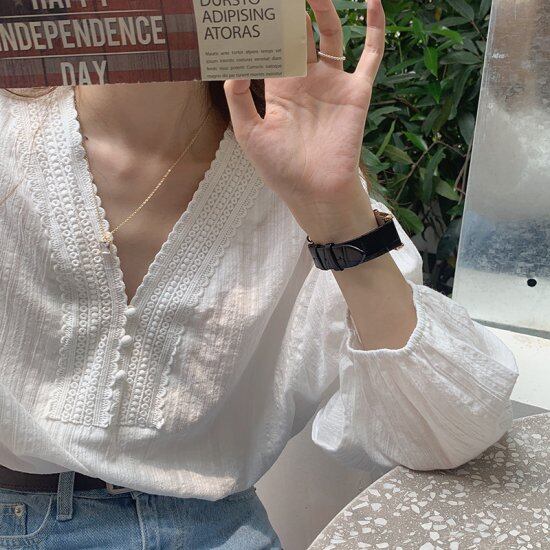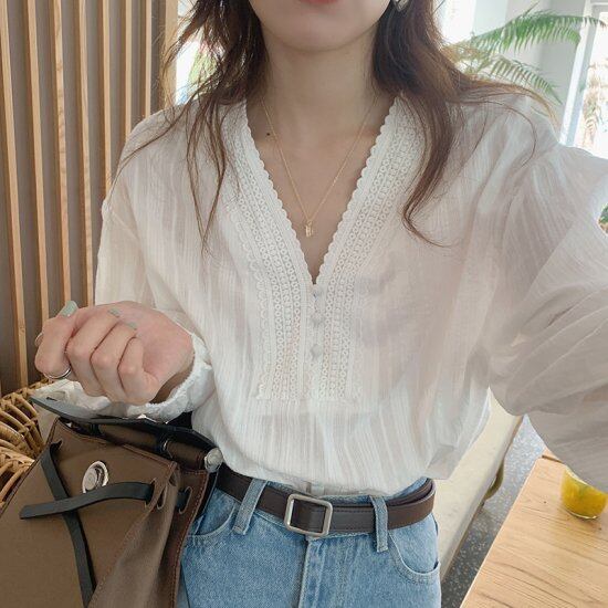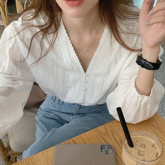 ブラウス レディース トップス ゆったり レース Vネック シャツ ふんわり 透け感 レトロ かわいい ブラウス レース ボタン パフスリーブ おしゃれ 新作 ブラウス レディース トップス