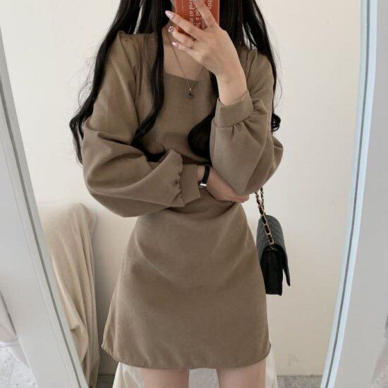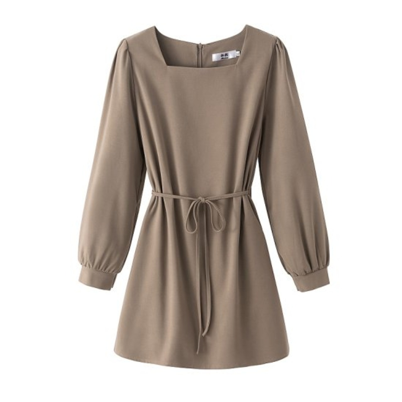 ワンピース ミニワンピース 長袖 レディース ミニ丈 スクエアネック ウエストリボン きれいめ チュニック シンプル ミニ丈 春 秋 ボリューム袖 20代 30代 ぽわん袖 ワンピース