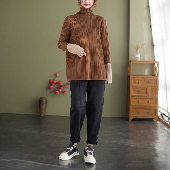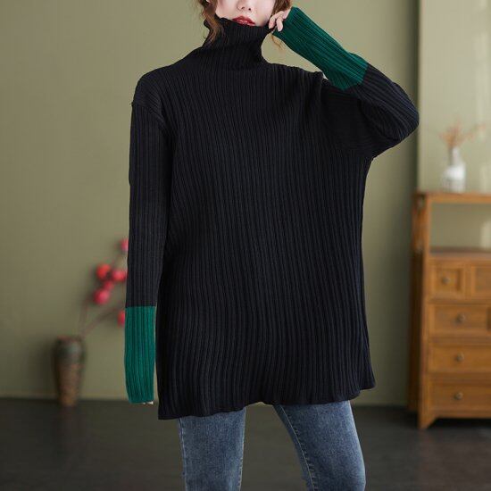 タートルニットソー レディース 韓国 ファッション 秋冬 トップス ロング袖 バイカラー カットソー タートル ロング プルオーバー ツートン ハイネック ニット 上品 大人カジュアル とろみ素材