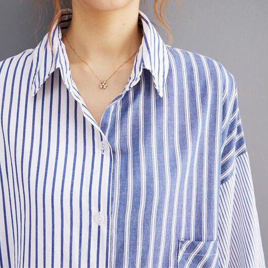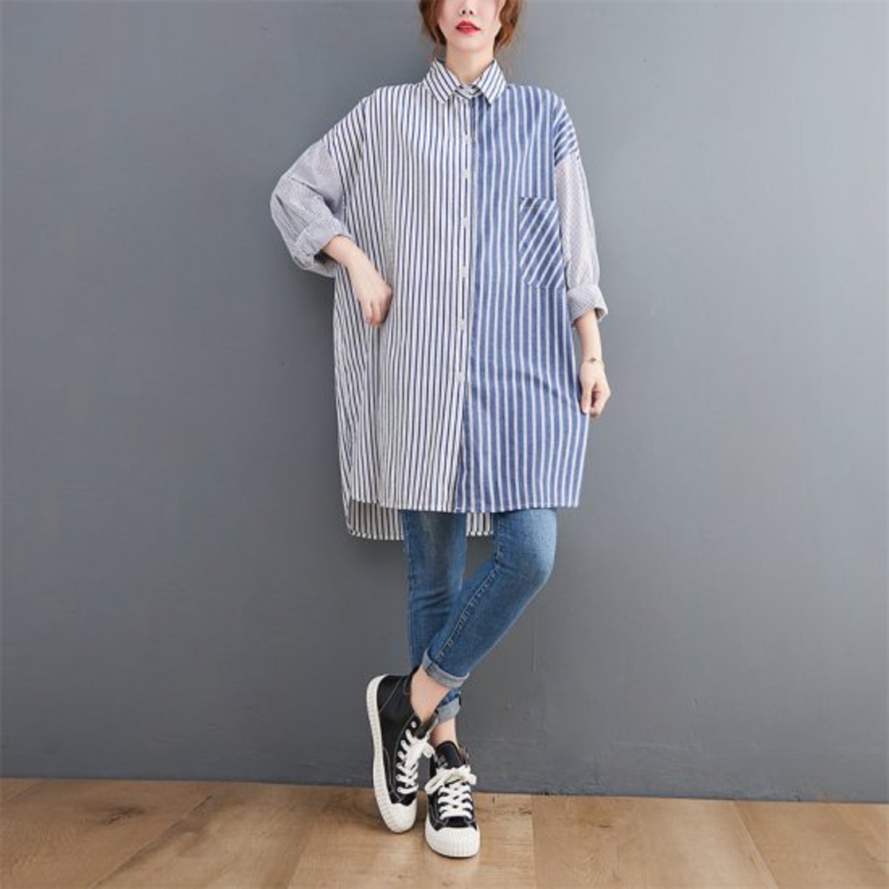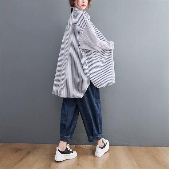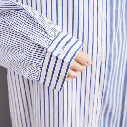 シャツ ストライプ ロングシャツ レディース 韓国 ファッション ブルー 大きいサイズ ゆったり メンズライク 大人カジュアル ワイドサイズ オーバーサイズ ビッグサイズ ロングシャツ ストライプ