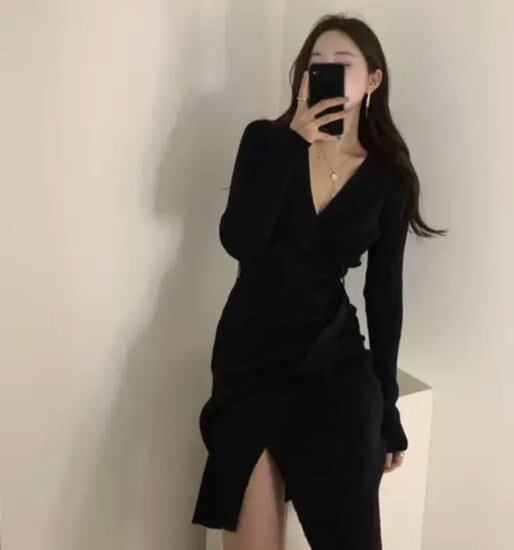 首元のVネックデザインがデコルテを美しくみせてくれるのもポイント。