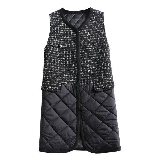 ロングベスト レディース 羽織 アウター ジレ ベスト ツイード キルティング 異素材ミックス ノースリーブ ロング丈 黒 ブラック 大きいサイズ カジュアル きれいめ おしゃれ ラウンドネック