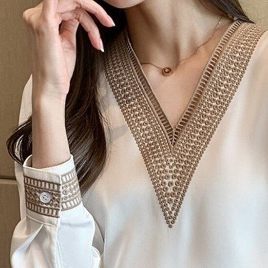 胸元のデザインが印象的なブラウスです。