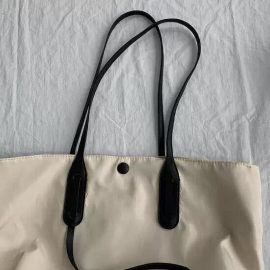 持ち手部分はフェイクレザーになっているのでカジュアルすぎず、通勤にもおすすめ。