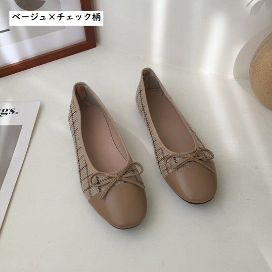 パンプス レディース ぺたんこ フラット パンプス レディース リボン ラウンドトゥ パンプス 秋冬 チェック柄 パンプス ツイード柄 パンプス レディース 無地 バイカラー ぺたんこ フラット