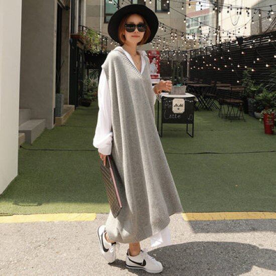 ニットベスト レディース ワンピースベスト フレンチスリーブ ロング丈 Vネック シンプル 無地 ゆったり 体型カバー オーバーシルエット ルーズ レイヤードスタイル カジュアル お出掛け