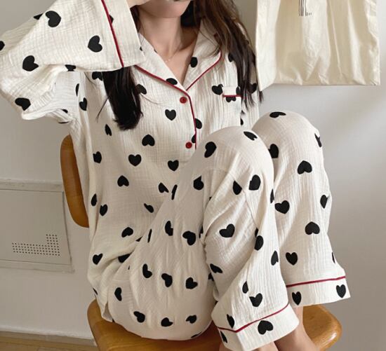 ルームウェア レディース パジャマ ナイトウェア 寝巻き 部屋着 リラックス カジュアル ハート柄 長袖長ズボン ポケット フロントボタン ゆったり ツーピース コットン 綿 セットアップ