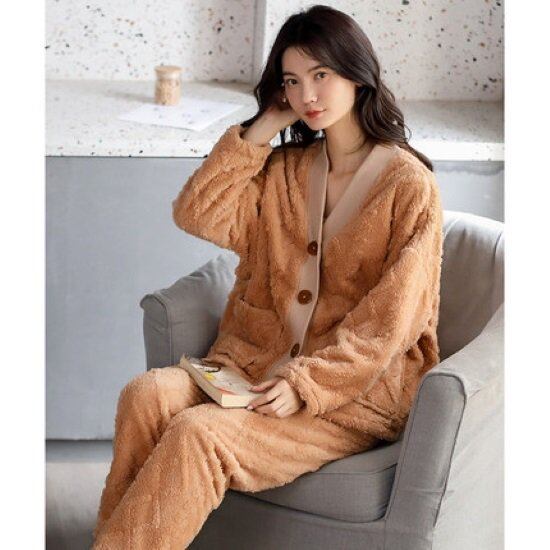 ルームウェア レディース ナイトウェア パジャマ おうち服 部屋着 寝巻き フリース 秋冬 暖かい 厚手 リラックス Vネック 長袖長ズボン ゆったり フロントボタン ポケット 上下セット