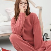 ルームウェア レディース パジャマ 長袖長ズボン 部屋着 寝巻き おうち服 リラックス 上下セット 2点セット シンプル 無地 ラウンドネック 厚手 フリース 秋冬 暖かい ゆったり ツーピース