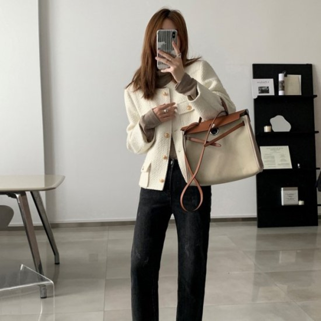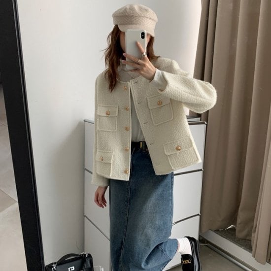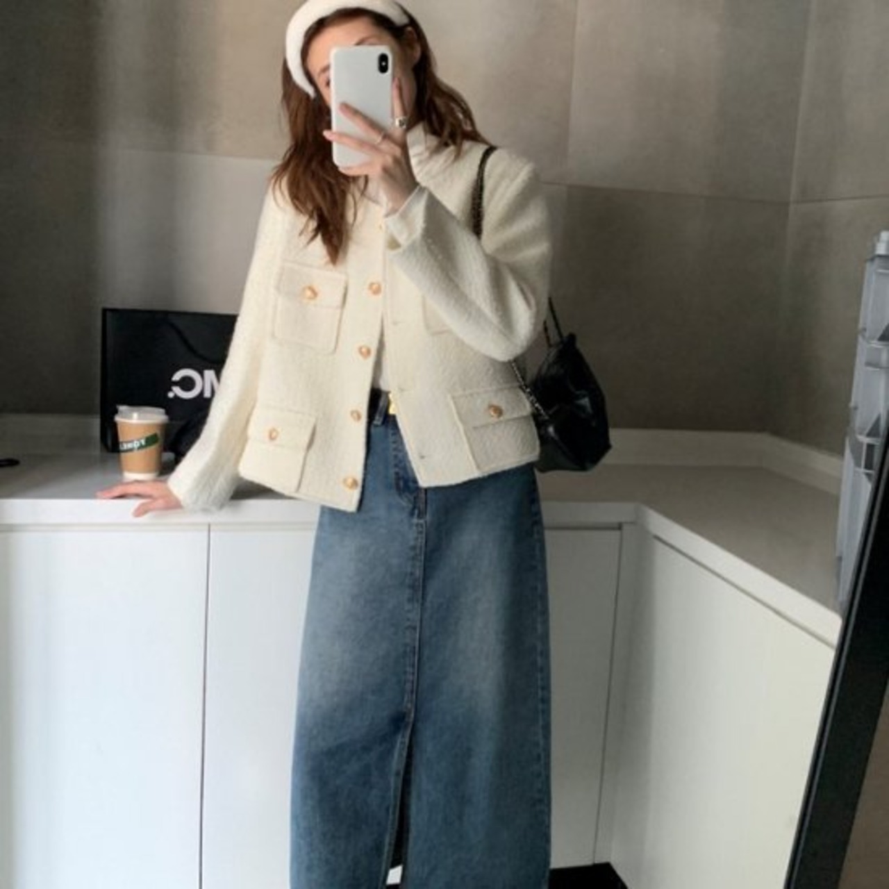 ツイード柄と金ボタンが女性らしい雰囲気を演出してくれます。