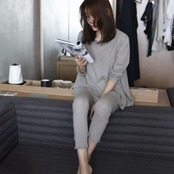 シンプルながらもボトムスの裾はフリルになったデザインでかわいらしいルームウエア。