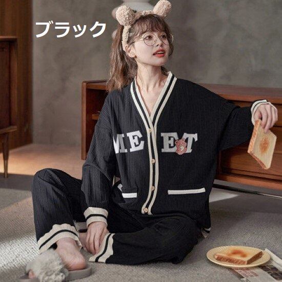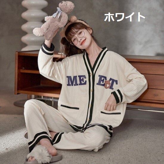 ルームウェア レディース パジャマ ナイトウェア 上下セット 2点セット Vネック 長袖長ズボン フロントボタン 前開き カジュアル リラックス ゆったり ポケット 部屋着 寝巻き おうち服