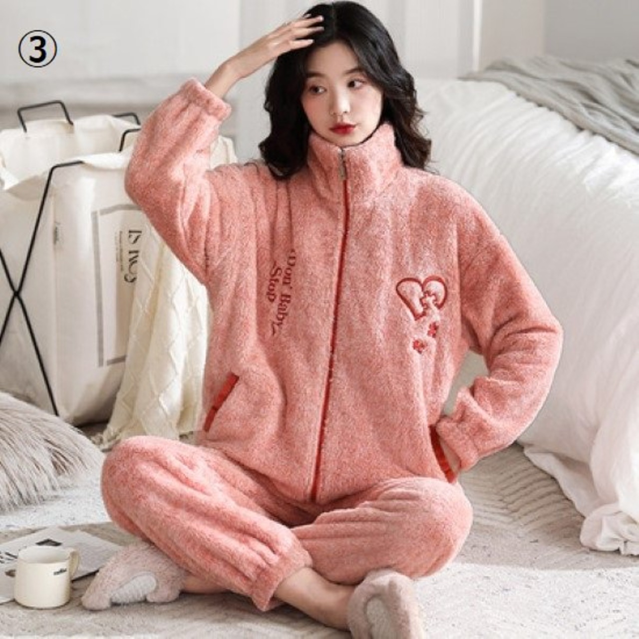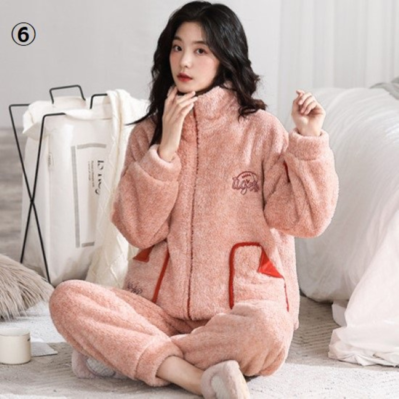 ルームウェア レディース パジャマ ジッパー 前開き ナイトウェア スタンドカラー フリース ふわふわ 暖かい 長袖長ズボン 厚手 秋冬 リラックス ゆったり 2点セット 上下セット おうち服