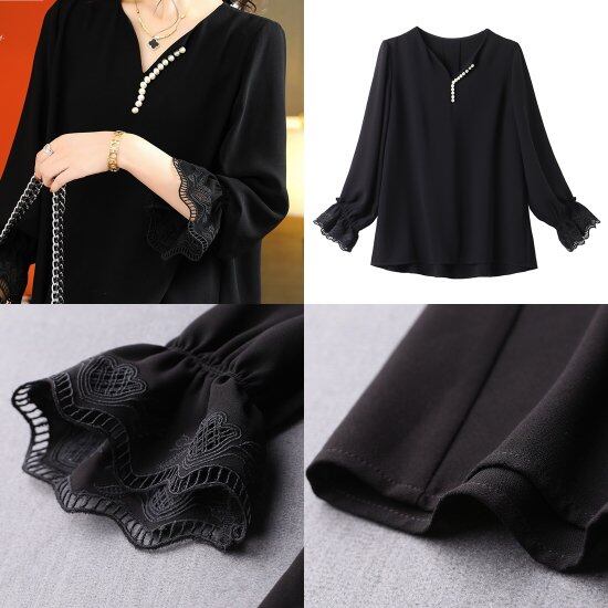 ブラウス レディース トップス とろみ素材 Vネック シフォンシャツ ふんわり パール レトロ かわいい ブラウス オフィス 通勤 レース おしゃれ 新作 ブラウス レディース トップス