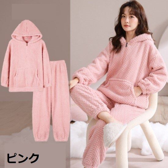 ルームウェア レディース パジャマ ホームウェア おうち服 ハーフジップ フード付き シンプル 無地 カンガルーポケット 長袖長ズボン 上下セット 秋冬 ピンク グリーン 2点セット 部屋着