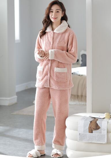 ルームウェア レディース パジャマ フリース ふわふわ 厚手 冬 襟あり 前開き フロントボタン シンプル ポケット 長袖長ズボン リラックス ゆったり 暖かい ピンク グリーン 無地 上下セット