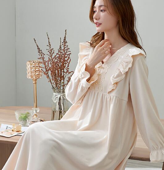 ルームウェア レディース パジャマ ルームワンピース ネグリジェ Vネック フリル レース 長袖 ホワイト ピンク リラックス ゆったり 体型カバー ロングワンピース おうち服 ホームウェア 部屋着