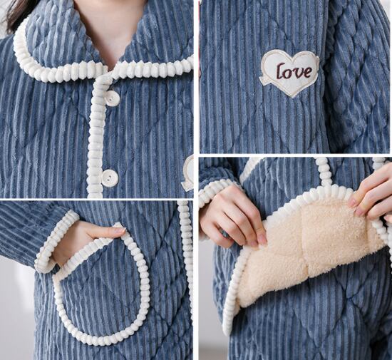 ルームウェア レディース パジャマ ホームウェア おうち服 厚手 冬 暖かい 襟あり 長袖長ズボン フロントボタン 前開き ハート ワンポイント ポケット シンプル 2点セット 上下セット リラックス
