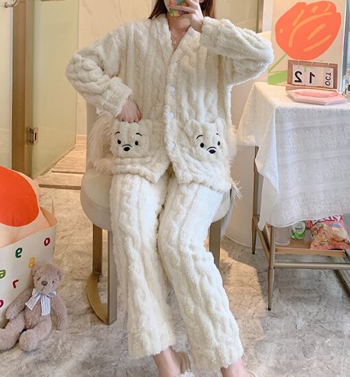 ルームウェア レディース パジャマ Vネック ふわふわ 暖かい 厚手 冬 くま アニマルモチーフ ポケット 可愛い リラックス カジュアル ゆったり フロントボタン 前開き 上下セット おうち服
