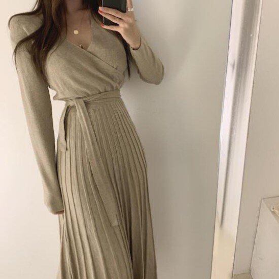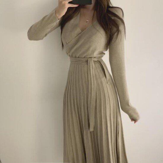 Vネックプリーツワンピース レディース プリーツスカート Vネック プリーツベルト ニットワンピース ミディ丈 ミディアム丈 きれいめ Vネックプリーツワンピース レディース プリーツスカート