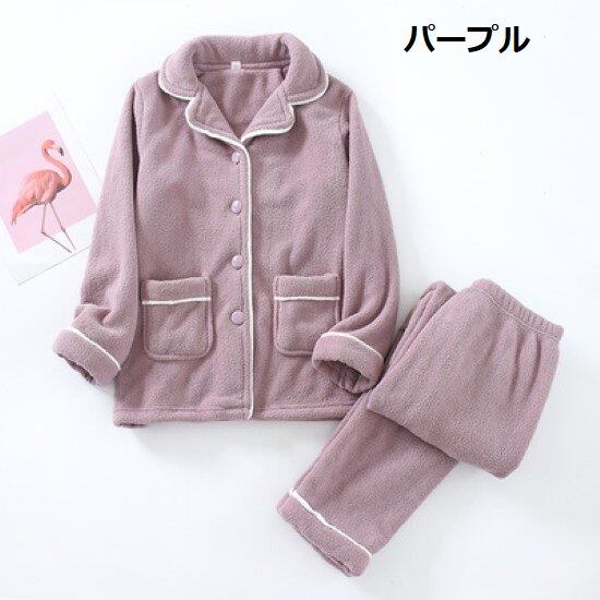 ルームウェア レディース パジャマ 襟あり フロントボタン 前開き ポケット シンプル 無地 パープル 紫 ピンク フリース ふわふわ 厚手 暖かい 冬 長袖長ズボン リラックス ゆったり おうち服