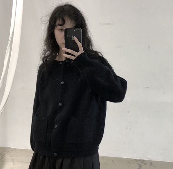 カーディガン レディース ジャケット アウター 羽織 トップス ポケット ラウンドネック ノーカラー ボタン シンプル 無地 シック カジュアル お出掛け 黒 ブラック 綿 コットン カーディガン