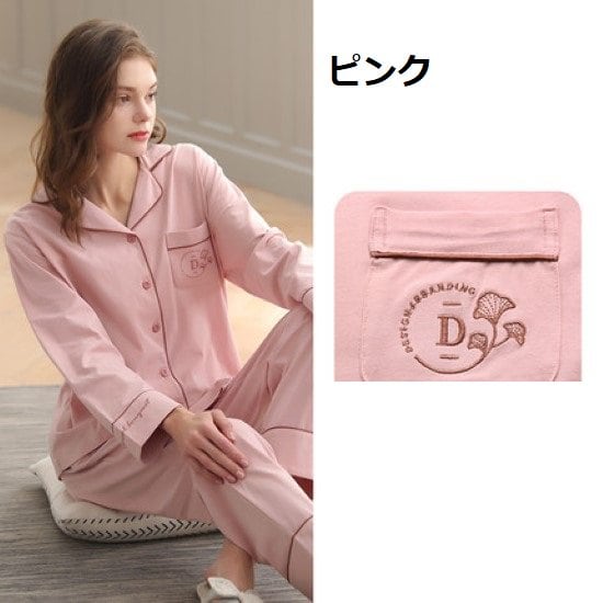 ルームウェア レディース パジャマ 上下セット 2点セット 長袖長ズボン フロントボタン 前開き 襟あり ポケット 刺繍 リラックス 綿 コットン 部屋着 寝巻き おうち服 カジュアル ルームウェア