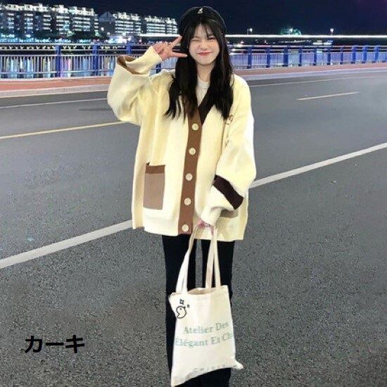 ニットカーディガン レディース カーディガン セーター 長袖 Vネック ボタン ポケット ゆったり ルーズシルエット 配色 カジュアル お出掛け おしゃれ 羽織 アウター トップス ニットカーディガン
