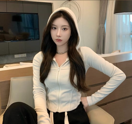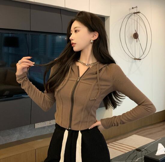 パーカー レディース トップス 羽織 長袖 フード付き 綿 コットン ショート丈 クロップド丈 フロントジップ スリムフィット カジュアル おしゃれ ホワイト ブラック ブラウン パーカー レディース