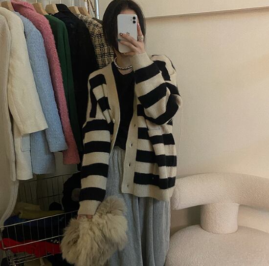 ニットカーディガン レディース カーディガン ボーダー カジュアル お出掛け おしゃれ 長袖 羽織 ライトアウター ルーズシルエット ゆったり Vネック ポケット ニットカーディガン レディース 羽織