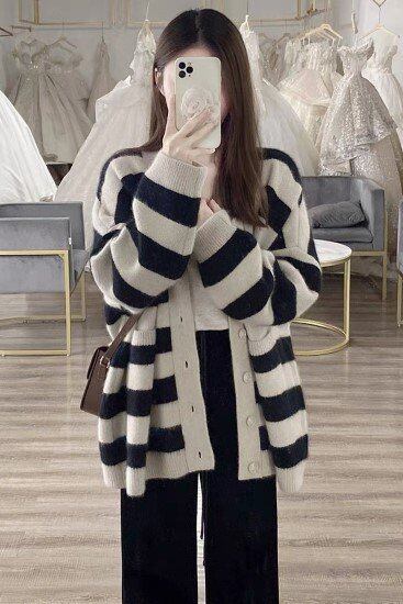 ニットカーディガン レディース カーディガン 羽織 ライトアウター 長袖 秋冬 ボーダー ルーズシルエット ゆったり カジュアル お出掛け おしゃれ ボタン ニットカーディガン レディース 羽織