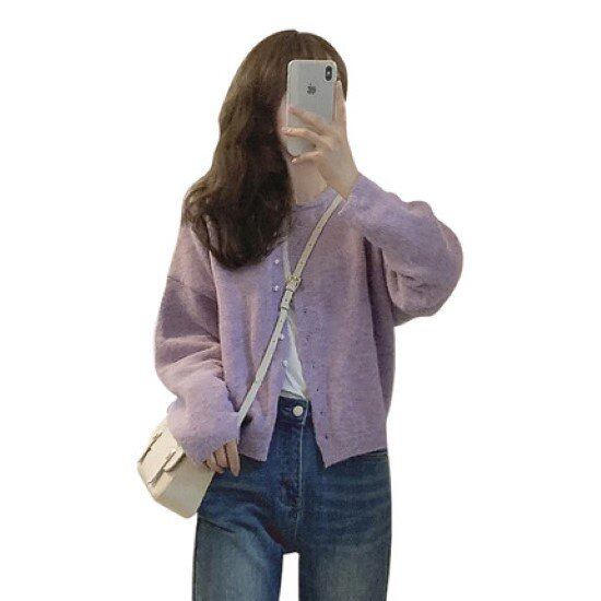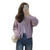 ニットカーディガン レディース カーディガン 羽織 トップス ライトアウター 長袖 ラウンドネック パープル 紫 ボタン シンプル 無地 カジュアル お出掛け きれいめ セーター 秋冬 暖かい ニット