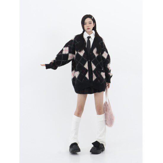ニットカーディガン レディース カーディガン 長袖 ミディ丈 チェック柄 アーガイル模様 カジュアル お出掛け おしゃれ Vネック 黒 ブラック 青 ブルー ボタン ポケット コットン 秋冬 ゆったり