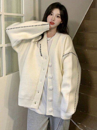 ニットカーディガン レディース カーディガン ルーズシルエット ゆったり 体型カバー 長袖 ライン ボタン カジュアル お出掛け 羽織 アウター 黒 白 ブラック ホワイト 秋冬 暖かい カーディガン