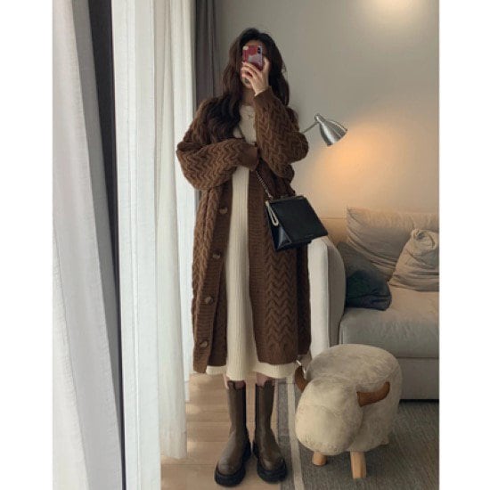 ニットカーディガン レディース カーディガン ロングカーディガン ニット セーター ロング丈 ケーブル編み ブラウン 茶色 長袖 厚手 秋冬 アウター 羽織 カジュアル お出掛け ニットカーディガン