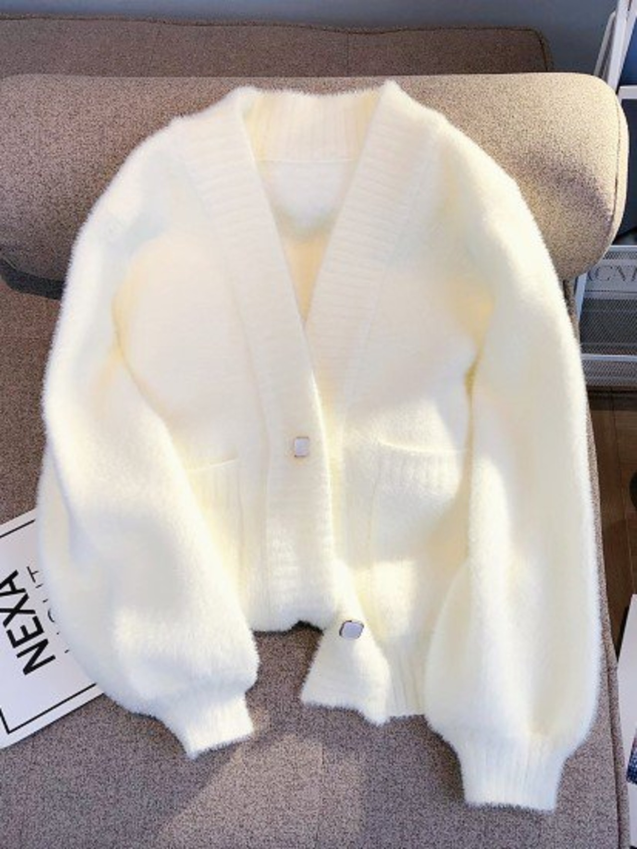ニットカーディガン レディース カーディガン 羽織 アウター ジャケット Vネック ボタン ポケット 長袖 ホワイト 白 秋冬 暖かい 綿 コットン ゆったり ルーズシルエット カジュアル きれいめ