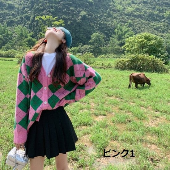 ニットカーディガン レディース カーディガン セーター Vネック ボタン 羽織 ライトアウター チェック柄 アーガイル模様 カジュアル お出掛け おしゃれ 秋冬 暖かい 長袖 ニットカーディガン