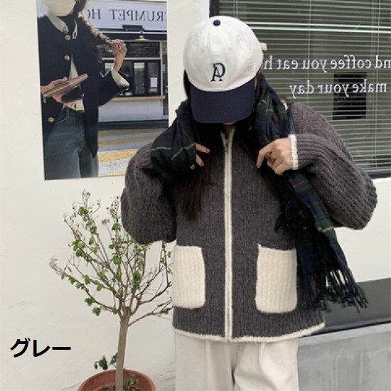 ニットカーディガン レディース カーディガン 羽織 アウター セーター フロントジッパー 襟あり ポロカラー シンプル 無地 カジュアル お出掛け トップス ポケット コントラストカラー 長袖 秋冬