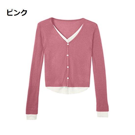ニットトップス レディース トップス フェイクツーピース 重ね着風 レイヤード フロントボタン Vネック シンプル 無地 カジュアル おしゃれ シャツ カーディガン ブラック ピンク 長袖