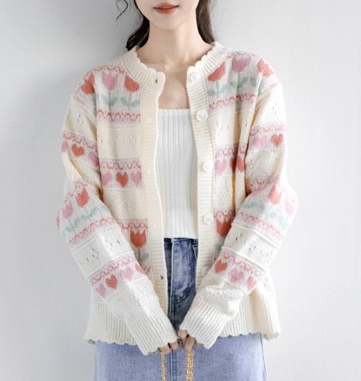 ニットカーディガン レディース カーディガン 羽織 ハート柄 花柄 フラワー チューリップ柄 フロントボタン 長袖 ラウンドネック 可愛い キュート カジュアル お出掛け ニットカーディガン 羽織
