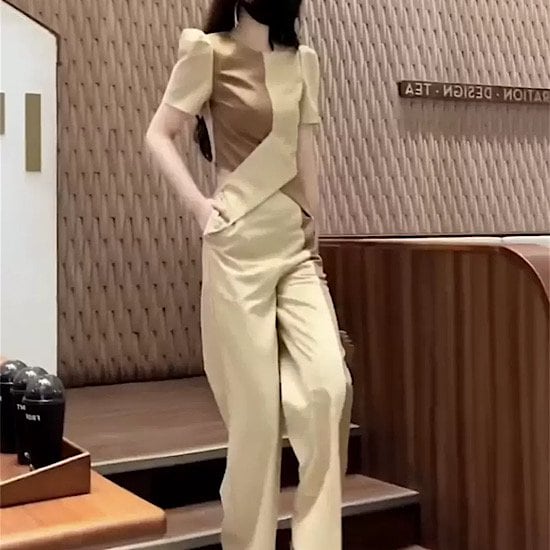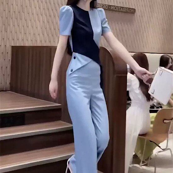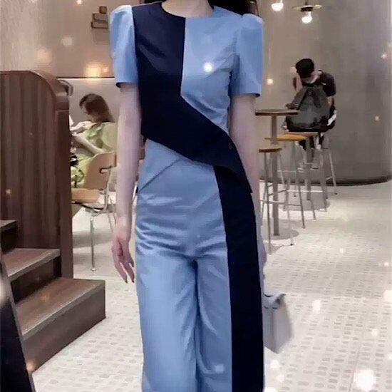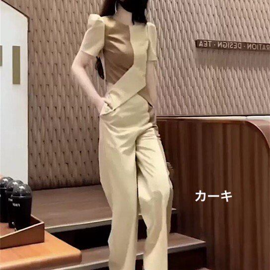 スーツ パンツスーツ ツーピース バイカラー 個性的 半袖 ラウンドネック フロントクロス 発表会 演奏会 レディース 切り替え カジュアル ステージ衣装 ロング丈 エレガント 無地 クール